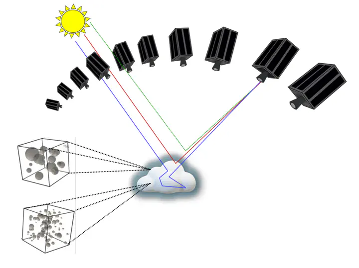 The CloudCT satellite setup for scattering computed tomographyThe CloudCT project is a mission that aims to demonstrate 3D volumetric scattering tomography of clouds. A formation of ten nanosatellites will simultaneously image cloud fields from multiple directions, at ≈20m nadir ground resolution. Based on this data, scattering tomography will seek the 3D volumetric distribution of cloud properties. We quantitatively compare visible polarized imagers to other imagers considered for the mission. We investigated specifically visible light and short-wave infra-red imagers. Each possibility was considered using Large Eddy Simulation clouds. Major consideration criteria are tomographic quality in the face of sensor and photon noise, calibration errors and stray light. We check the sensitivity to unknown stray light and uncertainty in gain calibration.